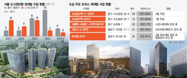 눈길을 끄는 대목은 서울 전 지역 중에서도 중구·종로구의 도시정비형 재개발 추진 증가세가 특히 가파르다는 점이다. 중구·종로구 제외 23개 구의 도시정비형 재개발 정비계획 수립은 △2021년 8건 △2022년 5건 △2023년 8건 △지난해 4건으로 감소세다. 건수도 2023년을 기점으로 중구·종로구에 뒤처졌다. 중구·종로구에 따르면 현재 두 구에서 업무시설 공급 목적으로 진행 중인 도시정비형 재개발 사업은 총 35건에 달한다.