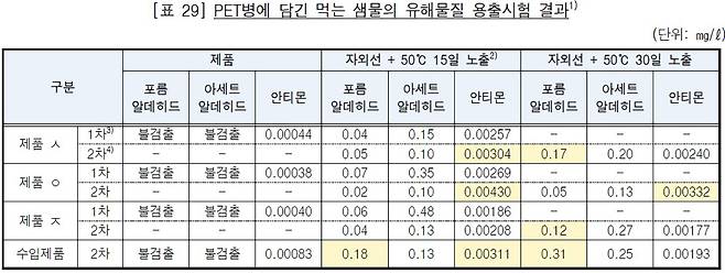 감사원 감사에서는 직사광선 노출 시 안전성을 파악하기 위한 실험도 진행됐습니다. 페트병에 담긴 생수를(국내 제품 3종과 수입 제품 1종) 여름철 오후 2~3시 정도의 자외선 강도와 50℃ 온도의 가혹 조건을 설정한 실험용 체임버에서 15일과 30일간 각각 노출한 뒤 생수의 수질을 검사하는 방식이었습니다. 15일 노출은 자연 상태에서 약 3.9개월에, 30일 노출은 7.8개월 정도에 해당한다고 감사원은 밝힙니다.