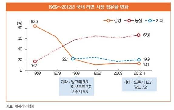 삼양이 1963년 삼양라면을 내놓은 이후 농심을 비롯한 후발주자들이 대거 시장에 뛰어들었다. '닭라면'을 앞세운 신한제분, '해표라면'을 내세운 동방유량, 풍년식품의 '뉴라면'까지 7~8개 업체가 난립했지만 결국 삼양과 농심의 2파전 양상으로 굳어졌다. 1969년까지만 해도 삼양의 시장점유율이 83.3%, 농심은 16.7%였다.1980년대에 들어서면서 춘추전국시대가 도래했다. 한국야쿠르트(현 팔도)와 빙그레가 라면 시장에 뛰어들었다. 식품업체 청보도 라면을 내놨다. 이후 오뚜기가 청보의 라면 사업을 인수하면서 현재까지 이어지는 삼양, 농심, 오뚜기, 팔도의 4강 구도가 틀을 갖추었다. 우지 파동이 있기 전인 1985년 라면 시장점유율 1위는 농심이었다. 1985년 말 라면 시장점유율은 농심 42.2% 대 삼양 40.9%를 기록했다.