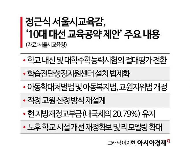 13일 정 교육감은 제21대 대선을 앞두고, 차기 정부의 10대 교육 과제를 각 정당에 제안·전달했다. 대입제도 개선, 교원 정원 감축률 제한, 학생의 기초학력 보장 등이 핵심이다.