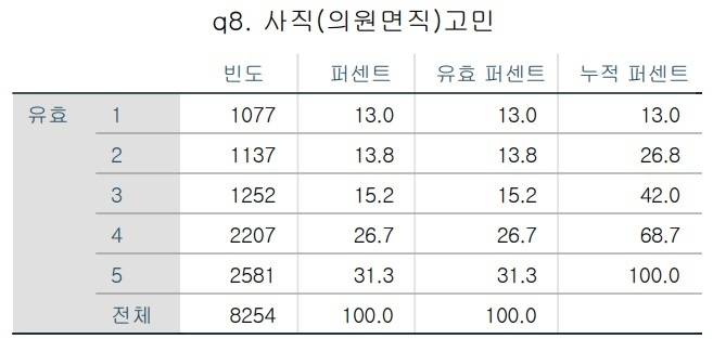 응답자의 58%(매우 그렇다 31.3%, 그렇다 26.7%)는 최근 1년간 이직 또는 사직에 대해 고민한 적이 있었다.