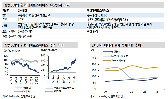 특히 이 연구원은 이같은 사례를 통해 최근 대규모 유상증자를 결의한 삼성SDI와 한화에어로스페이스의 경우 각각 주가 하락분을 최소화하거나 상승할 수 있다고 바라봤습니다.