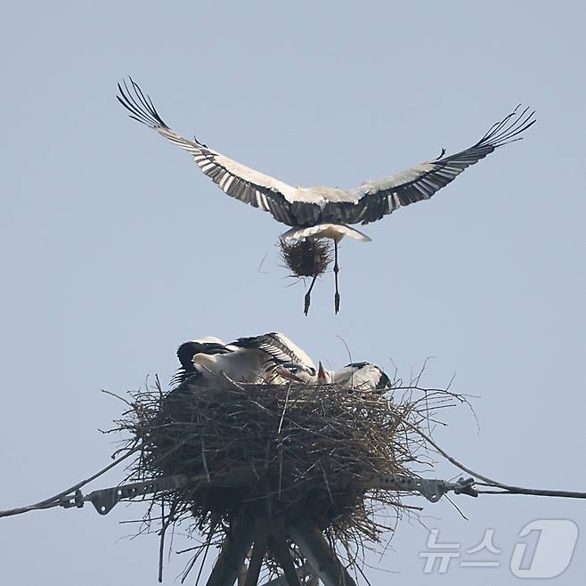 (나주=뉴스1) 이승현 기자 = 13일 전남 나주 부덕동 고압 철탑 위에서 발견된 멸종위기 야생동물이자 천연기념물인 황새. (광주환경운동연합 제공. 재판매 및 DB 금지) 2025.5.13/뉴스1