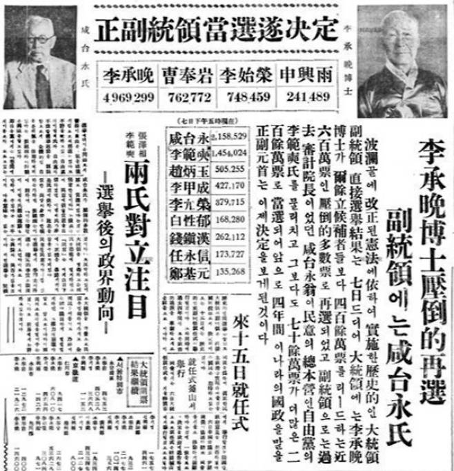 자기 당에 이익을 주는 선거부정이 아니라 무소속을 이롭게 하는 이상한 선거부정이었다. 이에 힘입어 무소속 함태영은 41.3% 득표율로 1위를 기록했다. 자유당 이범석은 25.5%, 민주국민당 조병옥은 8.1%, 또 다른 자유당의 이갑성은 7.0%였다. 나머지 18.1%는 여타 후보들이 나눠 가졌다. 러닝메이트의 조직적 방해를 감안하면 이범석의 25.8%는 대단한 기록이다.
