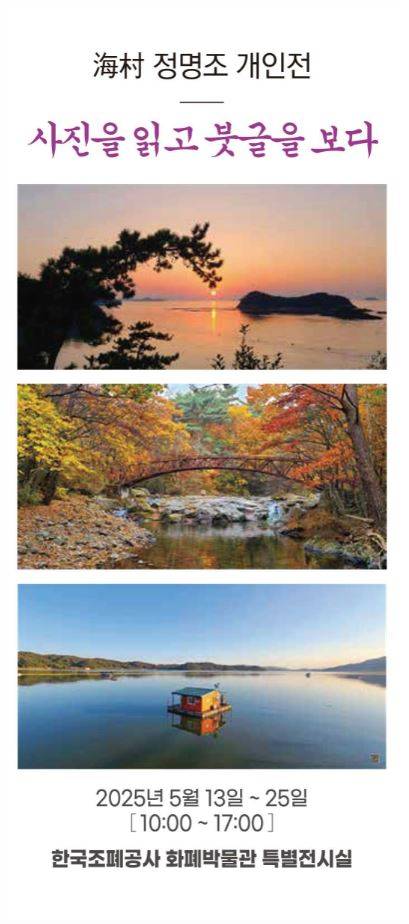 한국조폐공사 화폐박물관은 오는 25일까지 특별전시실에서 정명조 작가가 여행하며 사진을 찍고 글을 써 온 가운데 최근 기록을 바탕으로 한 두 권의 책에 실린 내용을 사진과 캘리그라피에 담아 선보이는 개인전 '사진을 읽고 붓글을 보다'를 개최한다.