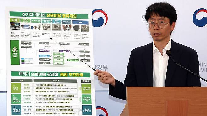 ▲ 환경부 배정한 이차전지순환이용지원단 부단장이 13일 정부세종청사 환경부 기자실에서 배터리 순환이용 활성화 방안에 관해 설명하고 있다.