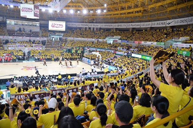 <사진> 노란색 단체 티셔츠 차림으로 열띤 응원을 보내는 창원 LG의 홈팬. KBL 제공