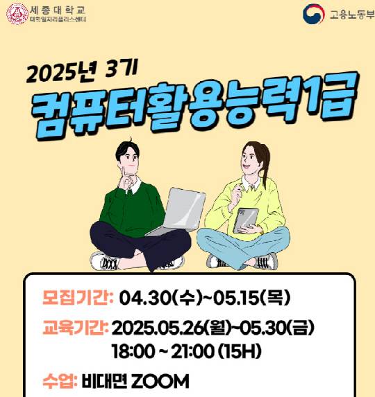 세종대학교 대학일자리플러스센터는 2025년 상반기 '컴퓨터활용능력 1급 대비반 3기' 취업실무과정을 운영한다.