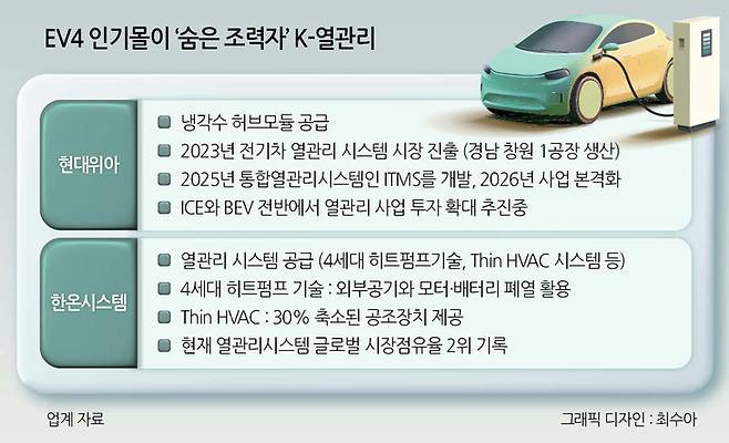글로벌 점유율 2위 열관리 기업인 한온시스템은 4세대 히트펌프 시스템과 Thin HVAC을 EV4에 공급 중이다.