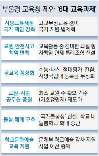 부산시교육청, 울산시교육청, 경상남도교육청은 14일 차기 대선 후보들에게 전달할 ‘6대 교육정책 과제’를 공동으로 발표했다. 전날 오후 김석준 부산시교육감, 천창수 울산시교육감, 박종훈 경남교육감은 정책 간담회를 열고 이에 합의했다.