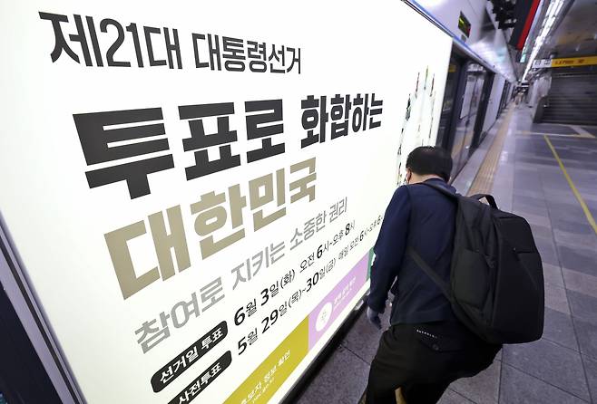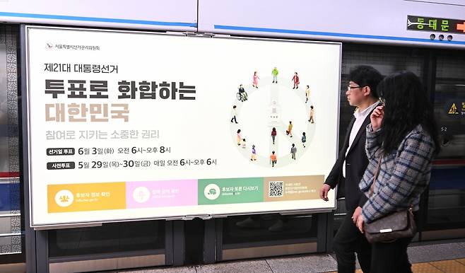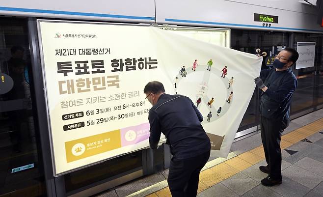 제21대 대통령선거를 20일 앞둔 14일 서울 종로구 지하철 4호선 혜화역 승강장에서 서울틀별시선거관리위원회 관계자들이 제21대 대통령선거 홍보물 래핑작업을 하고 있다.