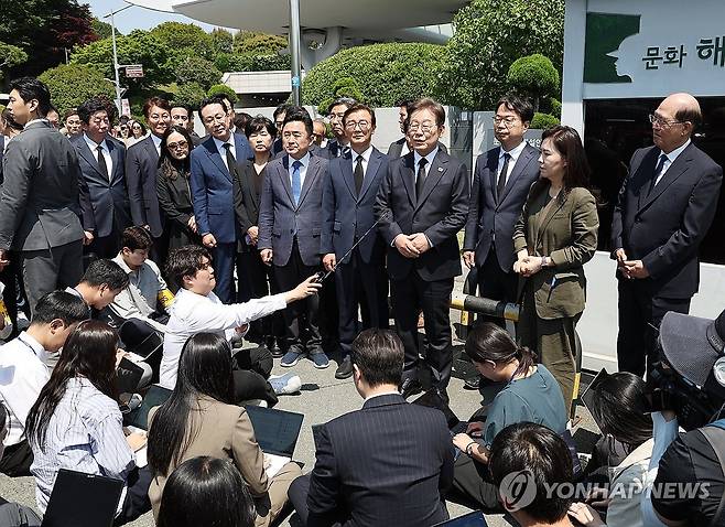 (부산=연합뉴스) 황광모 기자 = 더불어민주당 이재명 대선후보가 14일 부산시 남구 유엔기념공원을 찾아 참배 후 취재진 질문에 답하고 있다. 2025.5.14