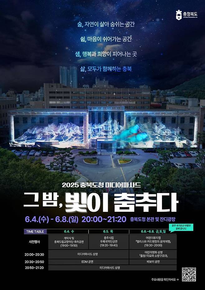 충북도는 다음달 4일부터 8일까지 도청사 본관과 잔디광장에서 '그 밤, 빛이 춤추다'를 주제로 미디어파사드 전시행사를 연다고 14일 밝혔다.