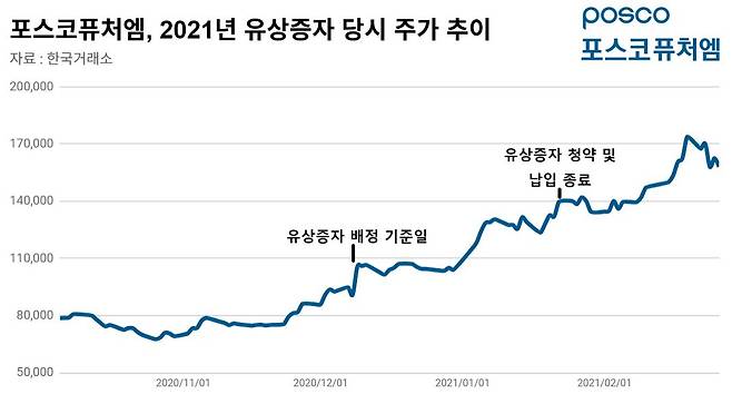 포스코퓨처엠은 2021년에도 1조2700억원 규모의 주주배정 유상증자를 진행했다. 당시엔 주가 상승 동력이 됐다. 유상증자 전인 2020년 12월 9만원대(수정주가 기준)였던 주가는 이듬해 2월 장중 18만4500원까지 뛰었다.