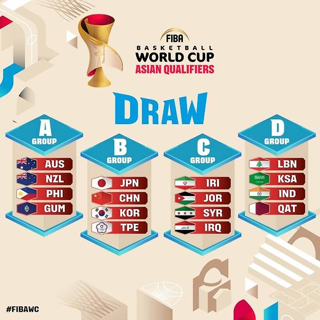 14일(한국시간) 카타르 도하에서 발표된 2027 FIBA(국제농구연맹) 농구 월드컵 예선 조 추첨 결과 대한민국(FIBA 랭킹 53위)은 중국(FIBA 랭킹 30위), 일본(FIBA 랭킹 21위), 대만(FIBA 랭킹 73위)과 함께 아시아 B조에 편성됐다.