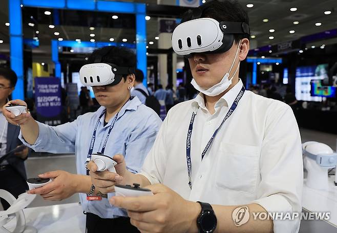 (서울=연합뉴스) 최재구 기자 = 14일 서울 강남구 코엑스에서 열린 2025 국제인공지능대전에서 관계자들이 AI와 VR을 활용한 제품을 시연하고 있다. 2025.5.14