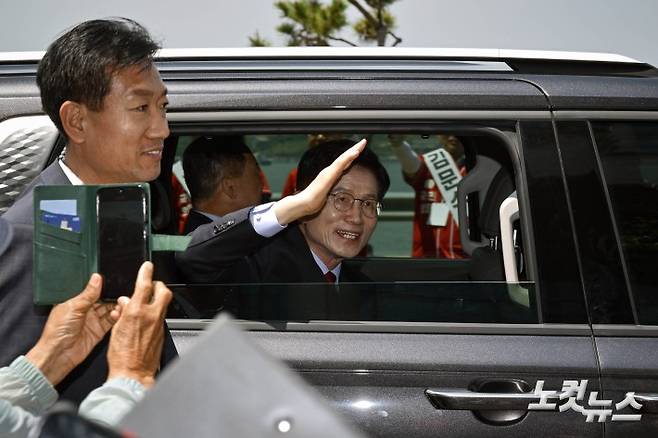 국민의힘 김문수 대선 후보가 14일 경남 사천시 우주항공청에서 간담회를 마친 뒤 현장을 나서며 지지자들에게 인사하고 있다.