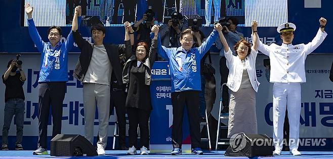 (부산=연합뉴스) 황광모 기자 = 더불어민주당 이재명 대선후보가 14일 부산 부산진구 서면에서 열린 유세에 도착해 단상에 오른 뒤 인사하고 있다. 2025.5.14