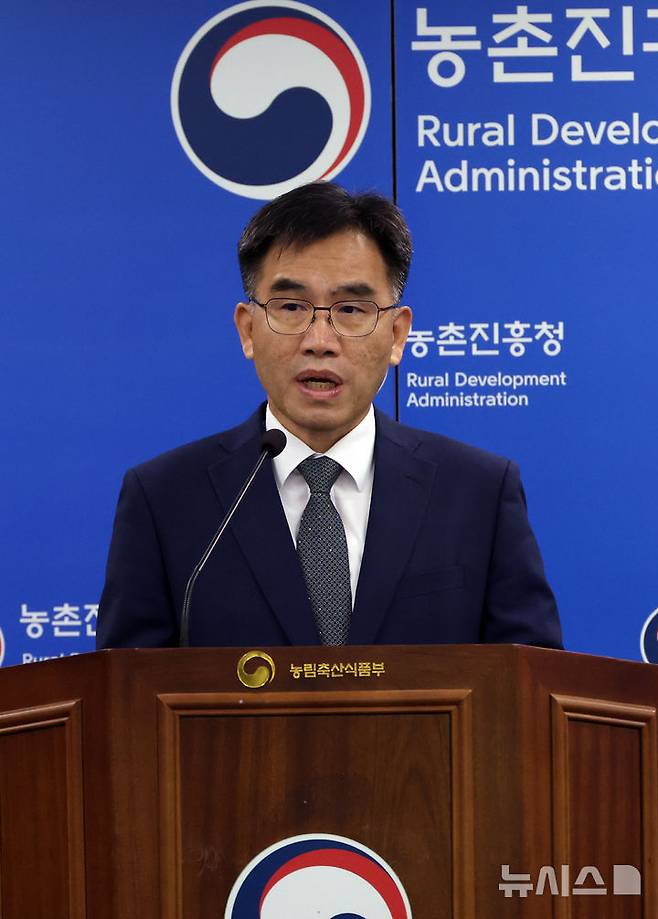 [세종=뉴시스] 강종민 기자 = 임기순 농촌진흥청 국립축산과학원장이 14일 세종시 정부세종청사에서 한우의 장내 발효 과정에서 발생하는 메탄을 18% 줄일 수 있는 사료 소재 '티아민 이인산'을 개발했다고 밝히고 있다.