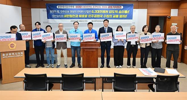 민주당 이선호 울산시당위원장과 진보당 방석수 울산시당위원장, 조국혁신당 황명필 울산시당위원장 등 정당인사와 임상호 울산진보연대 상임대표, 이은미 내란청산 사회대개혁 울산비상행동 상임대표 등 광장대선 울산연대 인사들은 14일 울산시의회 프레스센터에서 기자회견을 갖고 "광장의 힘, 주권자의 힘으로 승리하자"면서 "대선승리로 내란청산과 새로운 민주공화국 수립의 길을 열자"라고 목소리를 높였다.