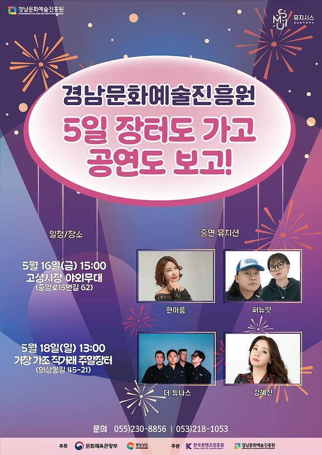 16일 오후 3시 고성군 고성시장 공연에는 트로트 뮤지션 '한아름', POP 그룹 '퍼뉴잇'이 출연한다.
