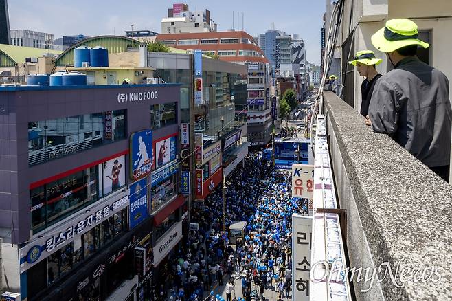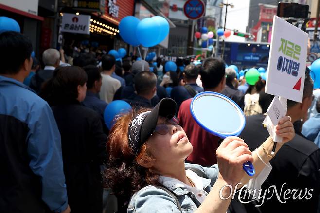 14일 이재명 더불어민주당 대선 후보가 유세 중인 부산 부산진구 서면쥬디스태화 인근에서 지지자들이 거울과 풍선을 들고 있다.