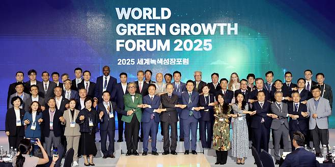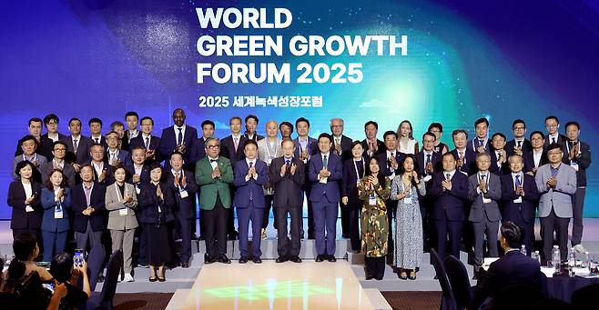 포항시가 주최한 세계녹색성장포럼(WGGF2025)이 ‘미래를 위한 녹색 전환, 도전 속에서 길을 찾다’를 주제로 15일까지 라한호텔에서 열린다. 첫날인 14일 오전 열린 개막식에서 이명박 전 대통령, 이강덕 포항시장, 김일만 포항시의회 의장, 이철우 경북도지사, 김정재 국회의원을 비롯한 내빈들이 기념 촬영을 하고 있다. /이용선기자 photokid@kbmaeil.com