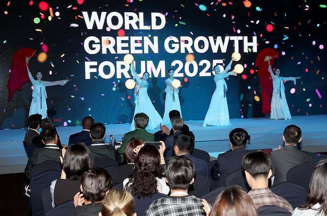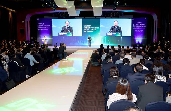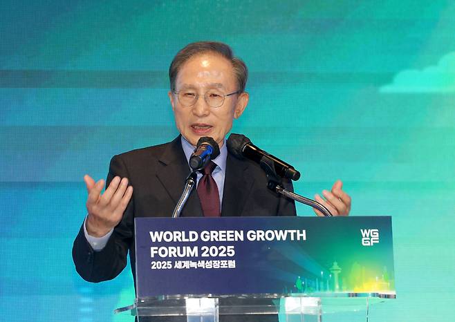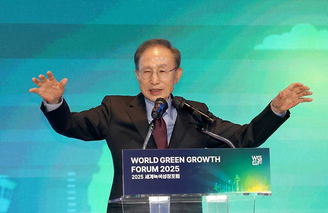 ‘포항시가 주최한 세계녹색성장포럼(WGGF2025)이 ‘미래를 위한 녹색 전환, 도전 속에서 길을 찾다’를 주제로 15일까지 라한호텔에서 열린다. 첫날인 14일 오전 열린 개막식에서 이명박 전 대통령, 이강덕 포항시장, 김일만 포항시의회 의장, 이철우 경북도지사, 김정재 국회의원을 비롯한 내빈들이 비전 선포 퍼포먼스를 하고 있다. /이용선기자 photokid@kbmaeil.com