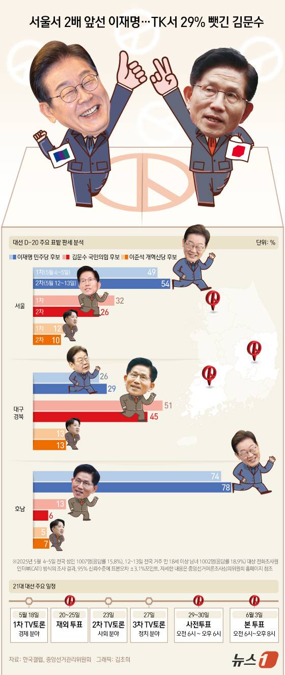 [오늘의 그래픽] 서울서 2배 앞선 이재명…TK서 29% 뺏긴 김문수