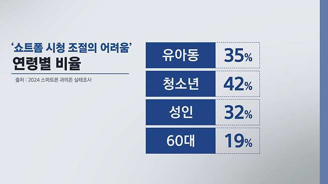 대상별로 보면 청소년에서 가장 높았는데, 성인과 60대 이상에서도 쇼트폼 중독으로 어려움을 겪었다는 응답이 나왔습니다.