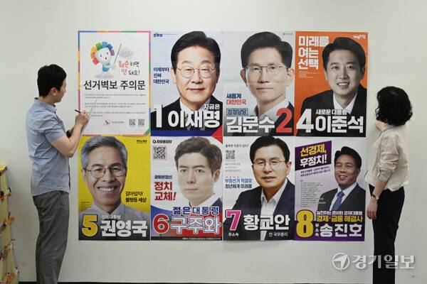 제21대 대통령선거를 앞둔 14일 인천광역시선거관리위원회 2층 다목적실에서 선관위 관계자들이 대통령선거용 벽보를 점검하고 있다.