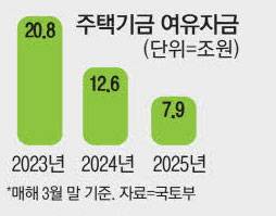 주택기금 여윳돈은 최근 몇 년 새 꾸준히 줄고 있다. 재작년 3월에 20조 8000억원이었던 여유자금은 작년 같은 기간엔 12조 6000억원으로 쪼그라들었다. 여유자금 규모는 올해 1~2월엔 10~11조원 수준을 유지하다 3월엔 결국 한자릿수대로 떨어졌다. 여윳돈이 통상 연초에 많고 연말로 갈수록 줄어든다는 점을 고려하면 더욱 우려되는 지점이다.