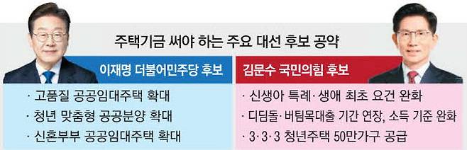 이재명 더불어민주당 대선 후보 역시 4기 신도시 건설, 신혼부부 위한 고품질 공공임대주택 확대, 청년 맞춤형 공공분양 확대, 전세사기 피해 지원 확대 등 공약을 내걸었다. 마찬가지로 주택기금의 여윳돈이 충분해야 실현 가능한 내용이다. 권대중 서강대 일반대학원 부동산학과 교수는 “어느 후보 할 것 없이 구체적인 재원 마련 방안이 안 보인다”며 “공약이 그저 공약으로만 끝날 수 있어 보인다”고 지적했다.