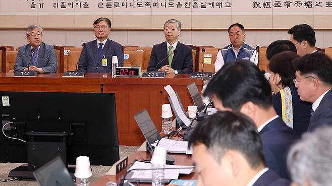 ▲ 14일 국회에서 조희대 대법원장 등 사법부의 대선 개입 의혹 진상규명 청문회가 열린 법제사법위원회 전체회의에 증인 및 참고인으로 출석한 서보학 경희대 법학전문대학원 교수(왼쪽부터), 이준일 고려대 법학전문대학원 교수, 서석호 변호사, 이성민 전국공무원노조 법원본부장 등이 의원 질의에 답변하고 있다.