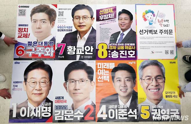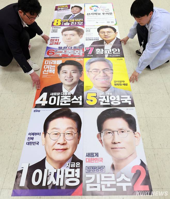 후보 기호는 1번 더불어민주당 이재명, 2번 국민의힘 김문수, 4번 개혁신당 이준석, 5번 민주노동당 권영국, 6번 자유통일당 구주와, 7번 무소속 황교안, 8번 무소속 송진호 후보로 결정됐다.