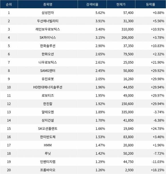 이어 검색비율 2위의 두산에너빌리티(034020)는 상승률 5.56%로 상승 마감했다. 검색비율 3위의 레인보우로보틱스(277810)는 10.91% 상승 마감했다. 검색비율 4위 SK하이닉스(000660)는 3.78% 상승했다. 검색비율 5위 한화솔루션(009830)은 10.83% 상승했다.