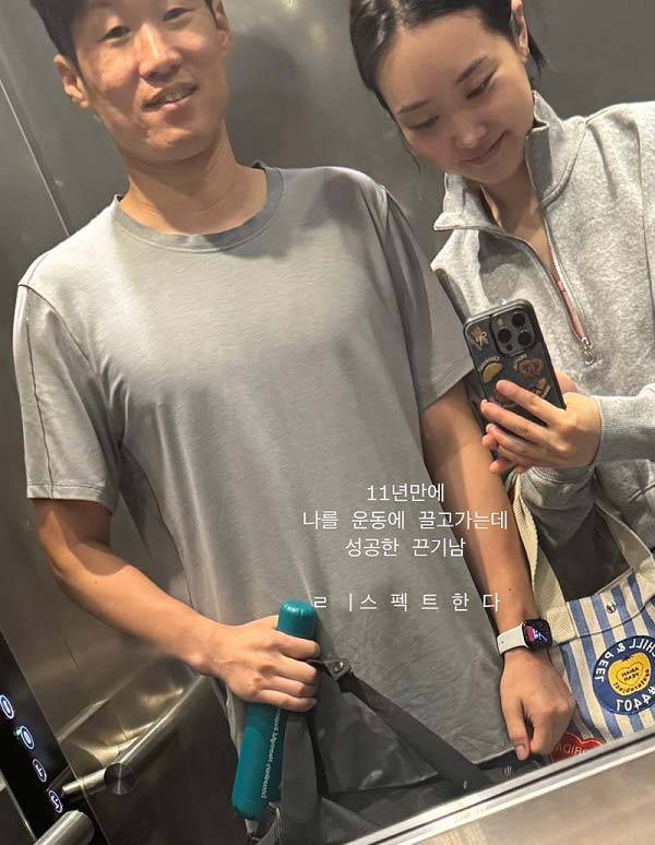 사진 속 김민지와 박지성은 운동복 차림으로 엘리베이터에서 셀카를 찍었다.
