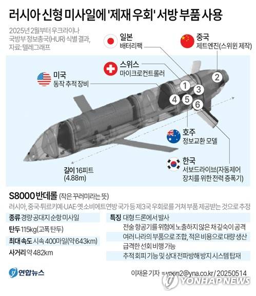 (서울=연합뉴스) 이재윤 기자 = 러시아가 최근 우크라이나 전쟁에서 사용한 신형 미사일에 한국·미국·일본 등 서방 부품이 사용된 것으로 드러났다고 영국 일간 텔레그래프가 13일(현지시간) 보도했다.