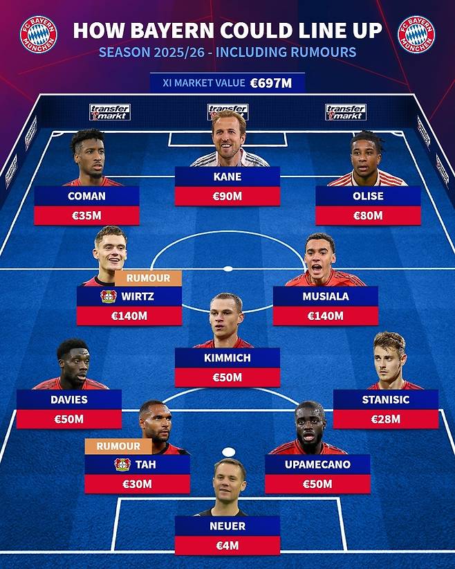 독일 축구 이적시장 전문 사이트 '트란스퍼마르크트'는 지난 14일(한국시간) 다음 시즌(2025-2026) 바이에른 뮌헨이 구성할 수 있는 베스트 11을 예상해 공개했다. 김민재는 제외됐다.