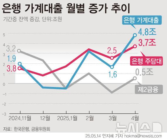 [서울=뉴시스] 지난달 전 금융권 가계대출이 5조3000억원 늘며 6개월 만에 가장 큰 폭으로 증가했다. 금리 하락과 토지거래허가구역 해제 등으로 주택담보대출이 늘고, 증시 변동성에 신용대출도 증가했다. 은행권 가계대출은 4조8000억원 증가했다. 기타대출도 신용대출 영향 등으로 전월 대비 1조원 증가했다. 은행 주담대는 3조7000억원을 늘었다. 제2금융권 가계대출은 5000억원 증가했다. (그래픽=안지혜 기자)