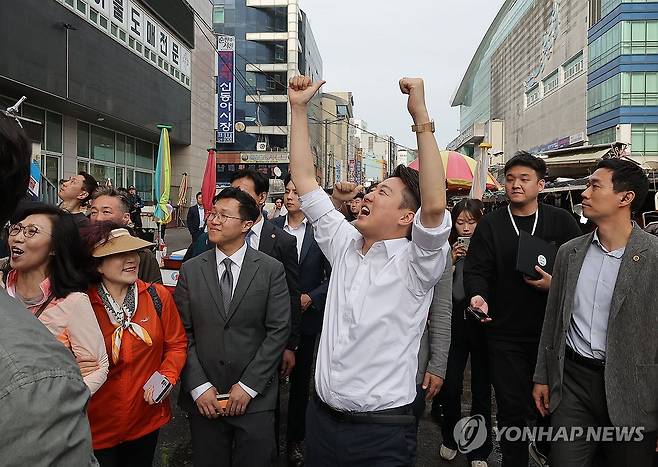 (부산=연합뉴스) 류영석 기자 = 개혁신당 이준석 대선 후보가 14일 부산 자갈치시장을 방문해 시민들과 인사를 나누고 있다. 2025.5.14