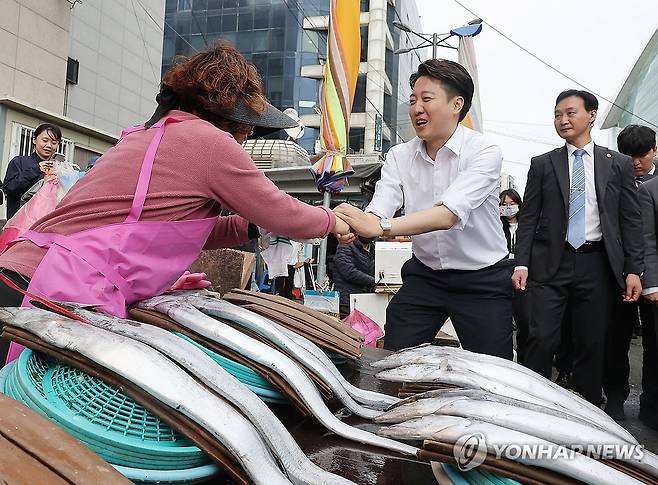 자갈치시장 상인 만나는 개혁신당 이준석 대선 후보