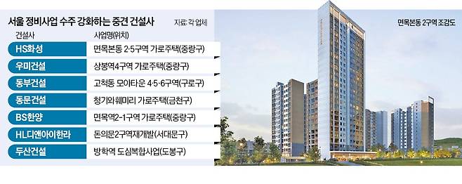동부건설은 지난달 구로구 ‘고척동 모아타운 4·5·6구역 가로주택 정비사업’ 시공사로 선정됐다. 지하 4층~지상 25층, 10개 동, 647가구를 짓는 사업이다. 공사 금액은 2100억원 규모다. HL디앤아이한라도 올해 서울 서대문역(돈의문2구역) 재개발과 남구로역세권 재개발 사업을 수주했다. 두산건설은 올초 도봉구 방학역 도심복합사업(420가구)과 쌍문역 동측 도심복합사업(639가구) 참여자로 선정됐다. 동문건설은 지난 2월 950억원 규모의 금천구 청기와훼미리 가로주택정비사업을 수주했다. BS한양은 1월 지하 2층~지상 10층, 266가구 규모의 면목역2-1구역 가로주택사업 시공권을 따냈다.