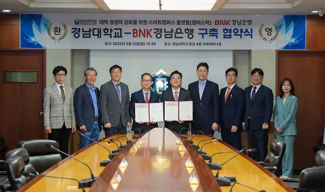 이날 협약식에는 홍정효 경남대 교학부총장과 허종구 BNK경남은행 창원영업그룹장(부행장), 이주형 디지털금융그룹장(부행장)을 비롯해 김용운 교무처장, 김창윤 학생처장, 오창규 정보전산원장 등 대학 관계자와 BNK 측 주요 인사가 참석했다.
