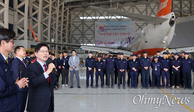| ▲ 김문수 국민의힘 대선 후보가 14일 경남 사천시 항공정비업체인 한국항공서비스(KAEMS)를 방문해 직원들에게 격려 인사말을 하고 있다. |