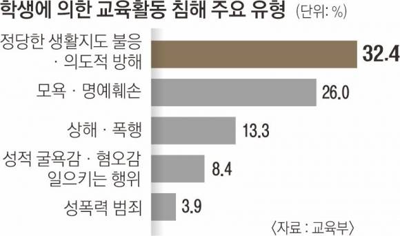 교사를 향한 폭언, 비난, 욕설은 이제 교실에선 흔한 풍경이 됐다. 교육부의 ‘2024학년도 교육활동 침해 실태조사’를 보면 학생에 의한 교육활동 침해 유형은 ▲정당한 생활지도 불응·의도적 수업 방해가 32.4%로 가장 많았고 ▲모욕·명예훼손(26.0%) ▲상해·폭행(13.3%)이 뒤를 이었다. 대구의 한 초등학교 교사인 C씨도 수업 중 소셜미디어(SNS)를 하는 학생에게 자제하라고 했다가 외려 욕설만 들었다. C씨는 “교장과 교감에게 이야기했지만, ‘네가 잘 지도했으면 그런 욕을 했겠냐’며 오히려 제 탓으로 돌렸다”고 전했다.