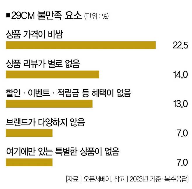 하지만 모든 기업이 그렇듯 29CM 앞에도 살펴봐야 할 변수가 숱하다. 그중 하나는 비싼 가격대다. 소비자 데이터 플랫폼 오픈서베이가 전국 15~39세 소비자 4000명을 대상으로 '패션 플랫폼 인식'을 조사한 결과, '비싼 가격(22.5%·복수응답)'을 단점으로 뽑은 응답자가 가장 많았다.