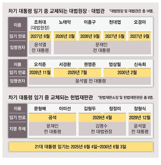 차기 대통령은 오경미(2027년 9월 임기 만료)·오석준(2028년 11월)·서경환·권영준(2029년 7월)·엄상필·신숙희(2030년 2월) 대법관의 후임자도 임명한다.
