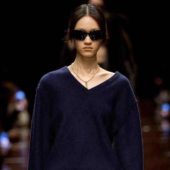 발렌시아가 컬렉션 속 관능미 넘치는 팬츠 리스 스타일에 네이비 니트를 더해 불금의 주인공이 되어보자. 네이비 니트를 입어도 숨길 수 없는 섹시함.