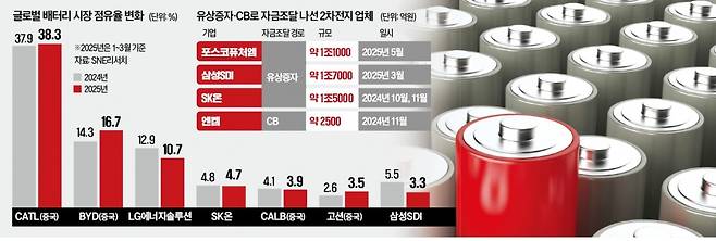 SNE리서치에 따르면 CATL(38.3%)과 BYD(16.7%)의 올 1분기 글로벌 배터리 시장 점유율은 지난해 대비 각각 0.4%포인트, 2.4%포인트 상승했다. 반면 LG에너지솔루션(10.7%)과 SK온(4.7%), 삼성SDI(3.3%) 점유율은 같은 기간 각각 2.2%포인트, 0.1%포인트, 2.2%포인트 하락했다. 전기차 배터리 시장이 가성비 높은 중국 기업의 리튬·인산철(LFP) 배터리 위주로 재편되는 영향이다.